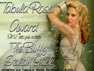 Questa categoria mi ha dato qualche problema... Infatti i due siti candidati mi piacciono tutti e due, e li trovo entrambi molto validi, quindi l'ideale sarebbe se potessi votarli entrambi. Se non si può, voto TBWOS, perchè la forma del forum mi sembra più adatta per un veloce inserimento delle news da parte di tutti i partecipanti al forum (ma mi piace tanto anche The Buffy Italian Guide, ti prego, fammeli votare tutti e due...:-)).